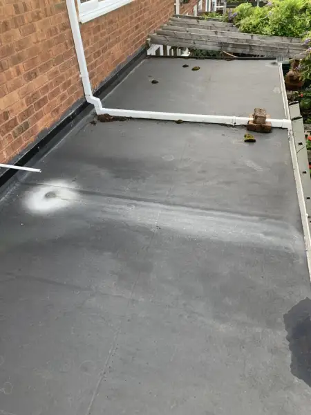 Little roof we did recently in Baddesley Ensor just outside Tamworth. The customer called us to report that they had a leak to a flat roof. When we got there it was observed that the roof had been recently done within a couple of years and had Firestone EPDM roof covering. Although this membrane is 1.2mm thick and has a warranty of 10 years the customer was not happy with it and wanted it replaced to stop the water ingress. We stripped off the membrane and replaced it with a 2mm torch on underlay with a 4.5mm polyester torch on mineral cap sheet. All edging details were finished in the same material. This material is a lot more hard wearing than the EPDM membrane and has a 15 year manufacturers warranty. Also the training course to fit EPDM is a 4 hour course opposed to our roofing operatives that have completed a 2 year NVQ.