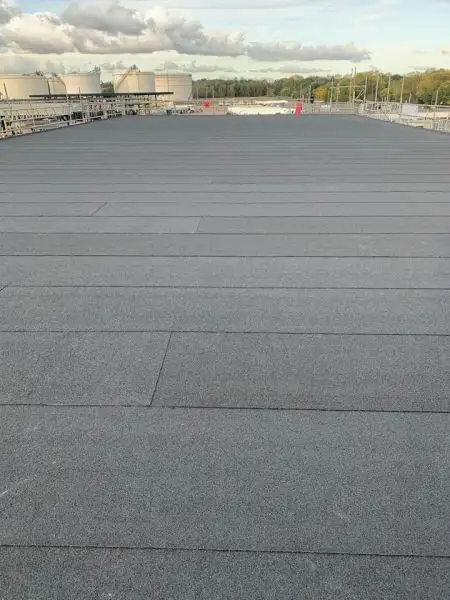 Large industrial felt roof we have recently finished at one of the oil storage facilities in Kingsbury. The roof was in a terrible state and had been leaking for many years. Once the work was issued to us we furnished the client with the relevant health and safety data and arranged for the roof to be scaffolded. We removed approximately 20 ton of grit and stripped off the damaged and perished felt. We then removed the water sodden fibre board insulation. This was done in sections to keep the workshop below as waterproof as possible. Once a section was removed, we primed the metal sheet roof and applied a 3mm polyester vapour barrier. We then glued a 15mm retrofit board to the vapour barrier and made that waterproof by torching a layer of 2mm underlay felt. This was then covered with a 4.5mm polyester cap sheet in mineral finish and edge flashings you match. This roof is covered with a manufacturers 15 year guarantee.